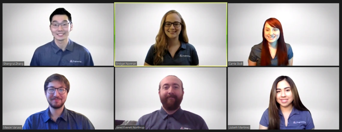 Team 21039. Top row: Shengrui Zhang, Bridget Norman and Carrie Stoll. Bottom row: Mason Varuso, Jared Northrup and Lizbeth Martinez